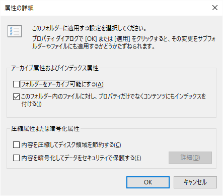なお、Windows Searchは標準ではファイル名と属性のみしかインデックス化しないため、ファイルの内容を全文検索したいフォルダに対しては、 プロパティで「このフォルダー内のファイルに対し、プロパティだけでなくコンテンツにもインデックスを付ける」をチェックする必要があります。